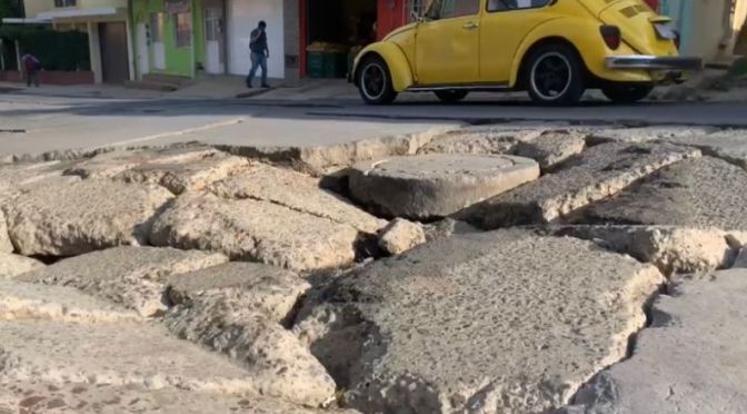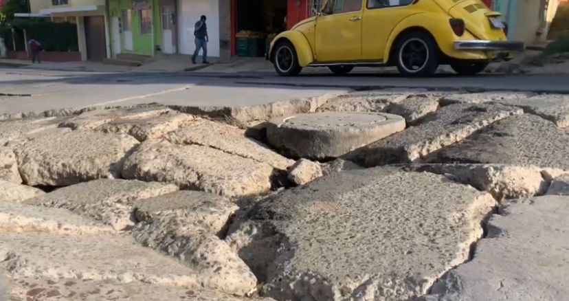 La calle está totalmente destruida en varias secciones, el concreto está fracturado y los automovilistas deben sortear para pasar sin accidentarse.