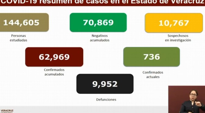 Asimismo, la encargada de Epidemiología de la Secretaría de Salud, Dulce María Espejo, dio a conocer que ya se acumulan 62 mil 969 casos confirmados, de los cuales 736 siguen activos.