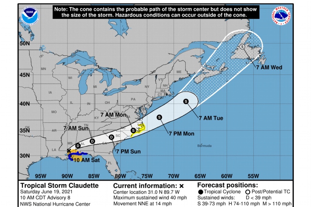 El centro de la #TormentaTropical #Claudette se localiza en tierra a 120 km al nor-noreste de Nueva Orleans, Louisiana, E.U.A., con #Vientos máximos sostenidos de 65 km/h, #Rachas de 85 km/h y se desplaza hacia el nor-noreste a 22 km/h. No genera efectos en el país. pic.twitter.com/F5h9QhvfSg— CONAGUA Clima (@conagua_clima) June 19, 2021