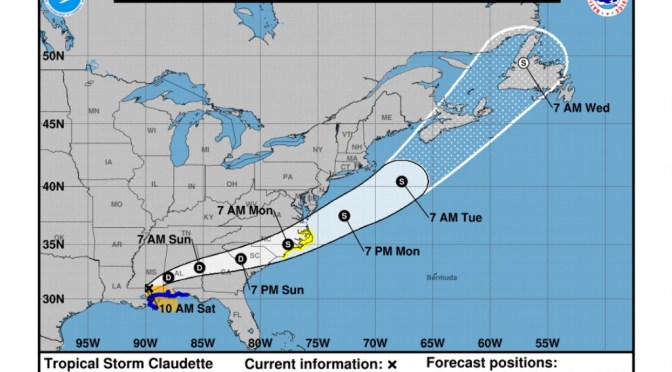 ‘Claudette’ presenta vientos sostenidos de 65 kilómetros por hora, con rachas de 85 kilómetros por hora, y se desplaza hacia el nor-noreste a 22 kilómetros por hora.
