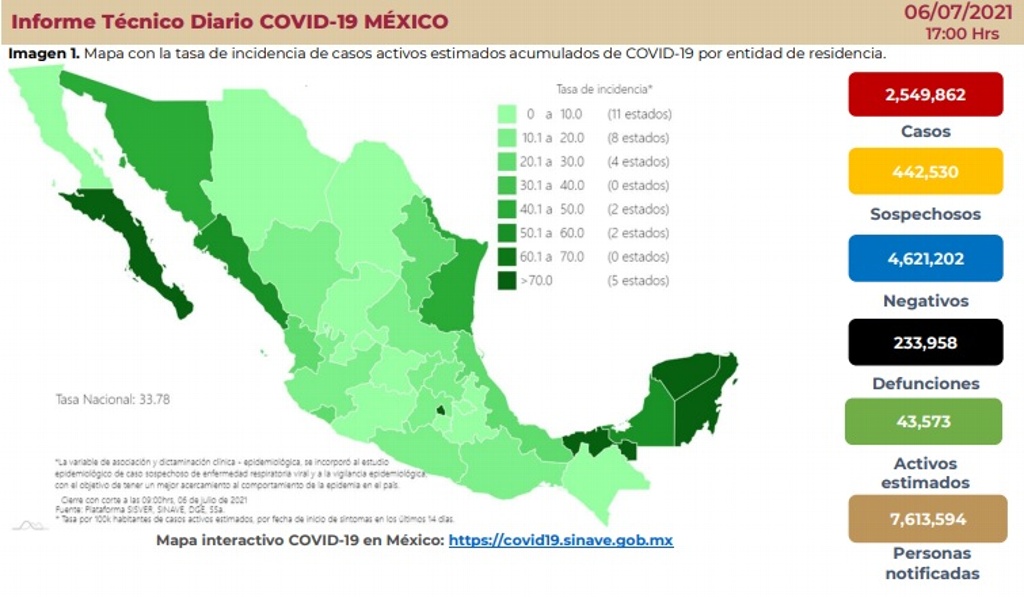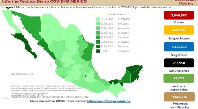 De acuerdo con el Informe Técnico publicado en el portal de dependencia, en territorio mexicano se han acumulado 2 millones 549 mil 862 casos confirmados.