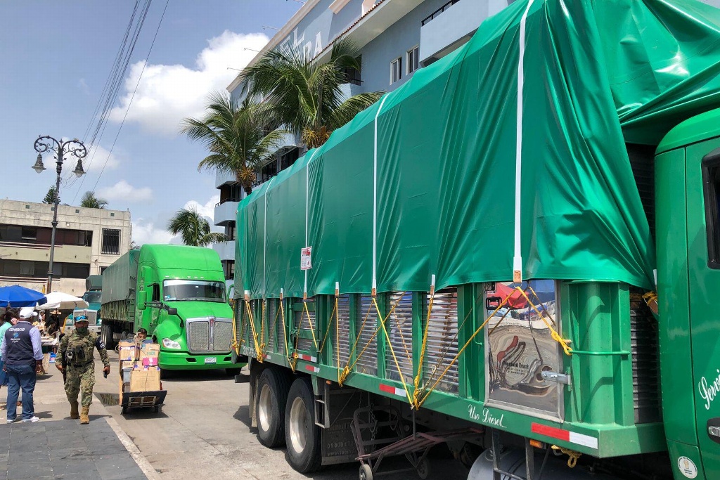 Gran parte de la ayuda ha llegado a la base aeronaval de Las Bajadas en Veracruz, desde donde se transporta vía terrestre en los camiones al muelle y es descargada por elementos castrenses y jóvenes del Servicio Militar.