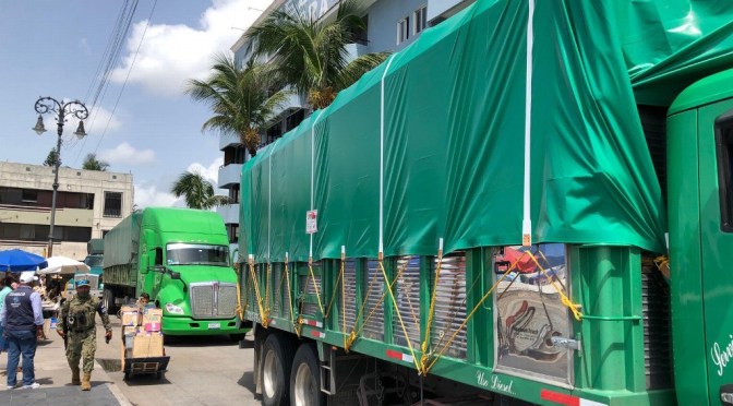 A ese punto están llegando los vehículos de carga pesada que transportan los insumos prometidos por el presidente Andrés Manuel López Obrador en una de sus conferencias matutinas.