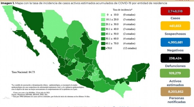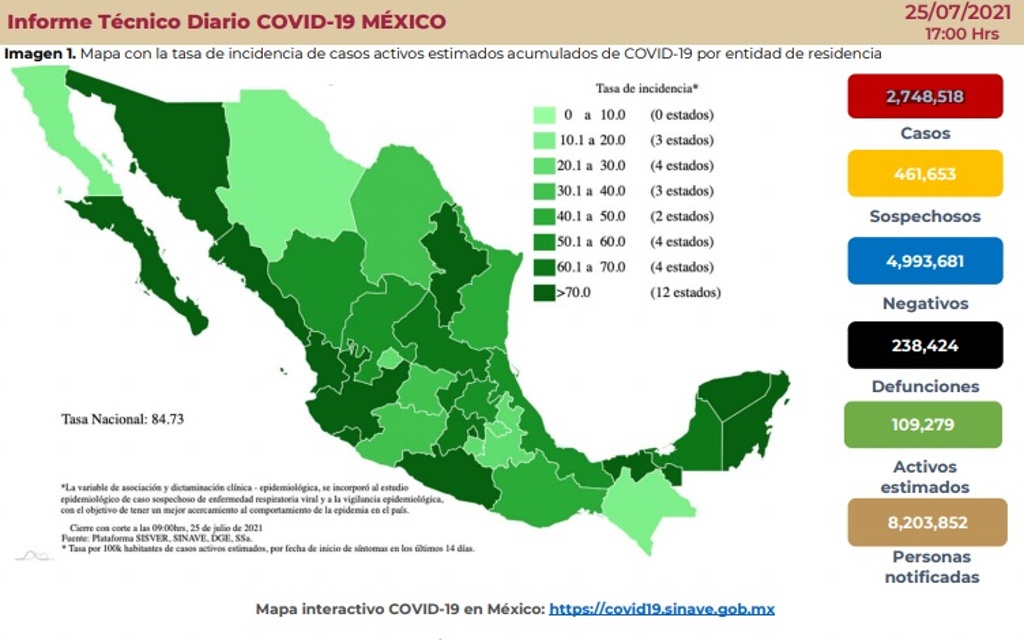 De acuerdo con el Informe Técnico publicado en el portal de dependencia, en territorio mexicano se han acumulado 2 millones 748 mil 518 casos confirmados.