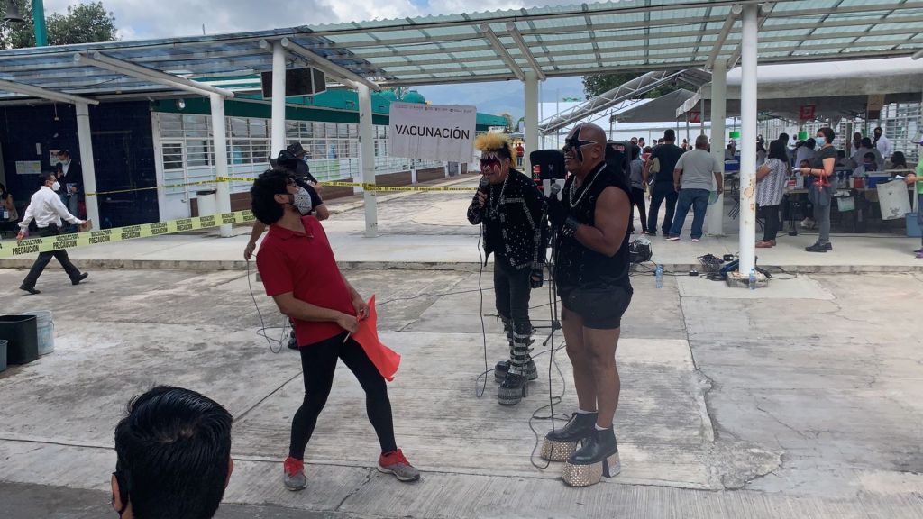 XALAPA, VER.- A pesar de haberlo anunciado en redes sociales minutos antes de su presentación para muchos resultó una agradable sorpresa la aparición de los Súper Caracoles en una de las sedes de vacunación en la capital del estado.