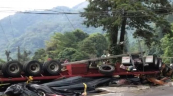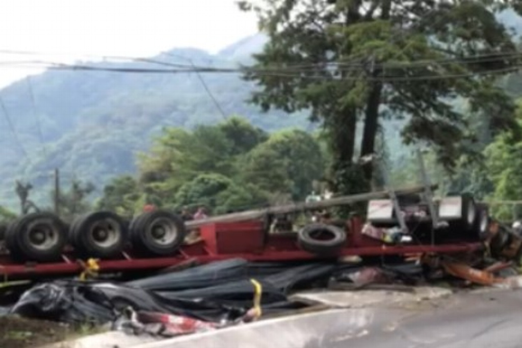 La tarde de este lunes, se registró una aparatosa volcadura de un tráiler sobre la carretera Banderilla-Naolinco.