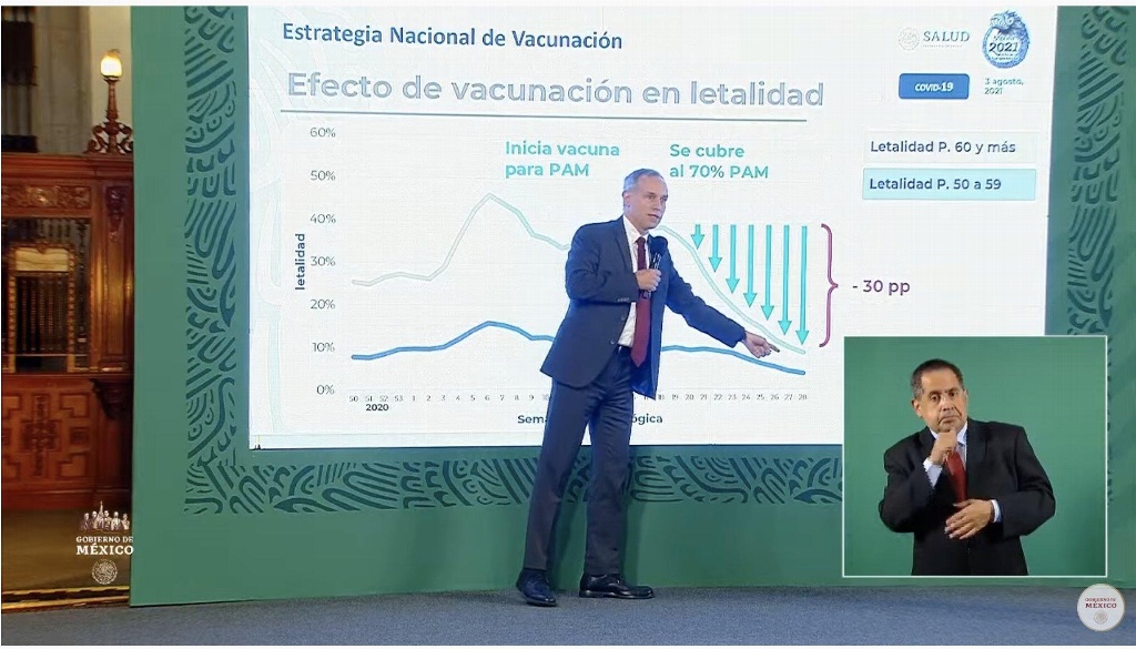 El subsecretario de Salud, Hugo López-Gatell, informó que el avance en la vacunación contra COVID-19 ha disminuido actualmente el porcentaje de la letalidad en México de más de tres cuartas partes.