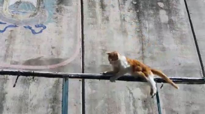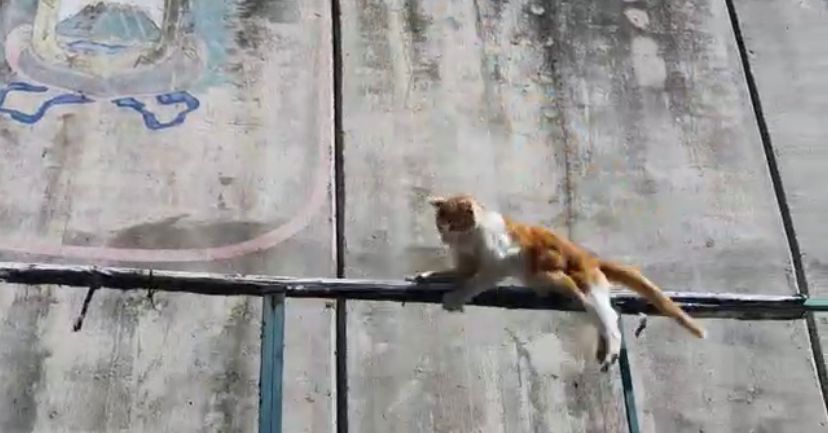 El minino aparentemente había perdido el equilibrio y cayó desde la parte de arriba del puente pero una estructura para colocar publicidad detuvo su caída hasta el suelo.