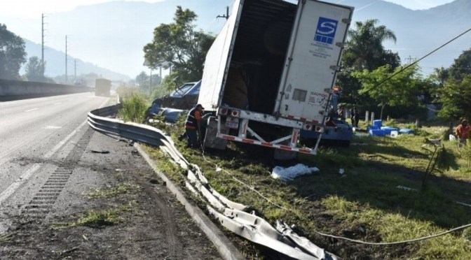Nogales, Ver.- Un operador lesionado, daños materiales y una inmediata movilización de cuerpos de rescate y de rapiñeros, fue el saldo que dejó la salida de camino y volcadura de un tráiler cargado con tambos de hipoclorito a la altura del Puente de Las Sillas en Nogales de la autopista Acatzingo-Ciudad Mendoza.