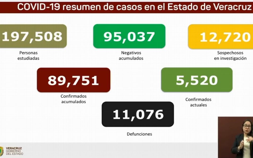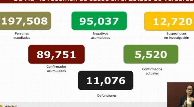 Asimismo, el director de Salud Pública, Salvador Beristain Hernández, dio a conocer que ya se acumulan 89 mil 751 casos confirmados, de los cuales 5 mil 520 siguen activos.