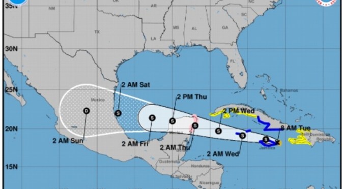 Detalló que el jueves cruzaría Cozumel y se internaría en el Golfo de México, el sábado a la 1 de la mañana se localizaría a 50 km al este-sureste de Tampico con100 km/h rachas de 140 km/h.