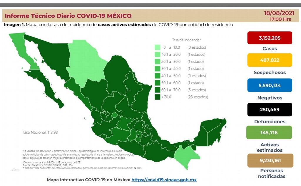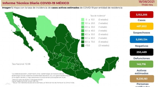 En tanto que los casos sospechosos a COVID-19 es de 487 mil 822; los casos activos estimados son 145 mil 716.
