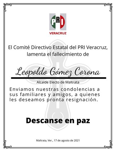 El PRI estatal lamentó el fallecimiento del alcalde electo, Leopoldo Gómez, a través de su dirigente Marlon Ramírez.