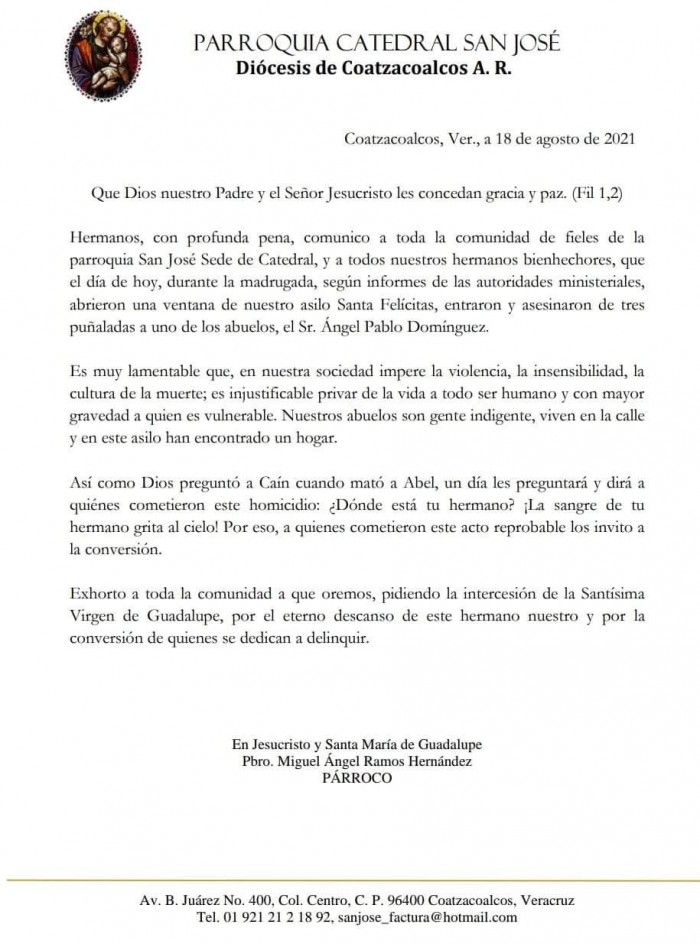 A través de un comunicado la Diócesis de Coatzacoalcos informó sobre este terrible hecho, en donde revelan que desconocidos abrieron una de las ventanas del refugio para entrar y asesinar a quien en vida respondió al nombre de Ángel Pablo Domínguez.