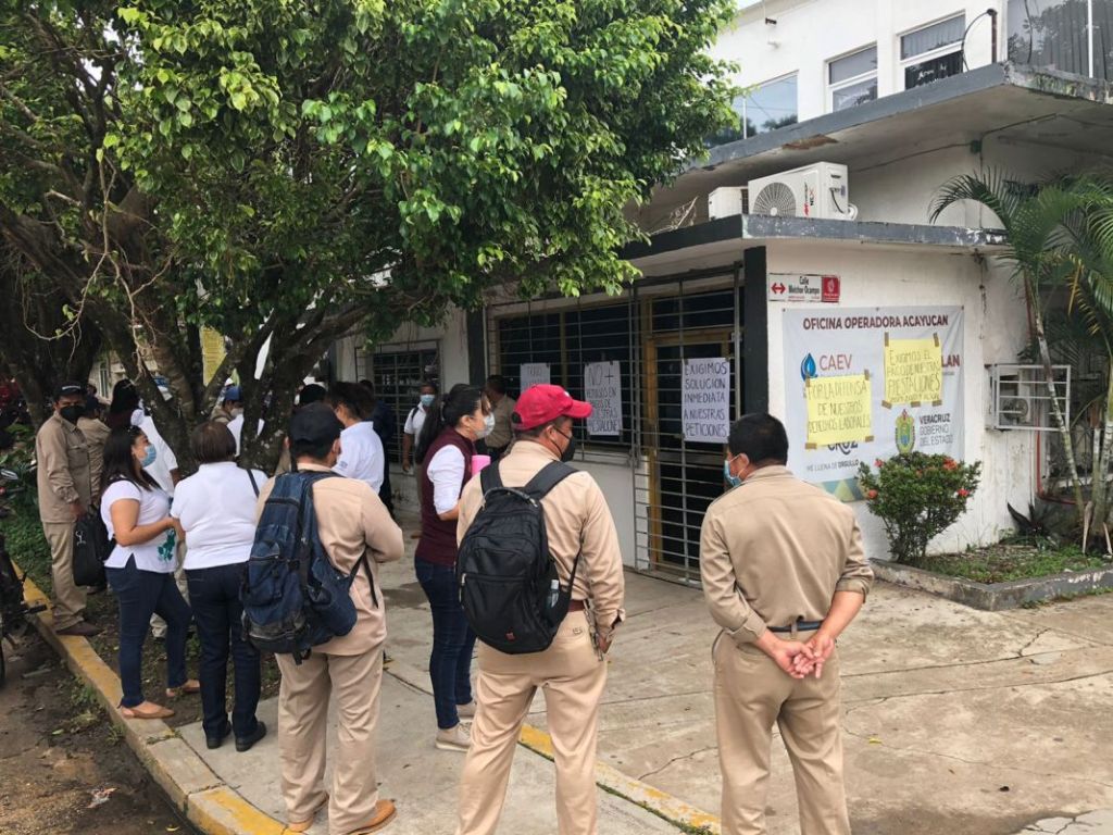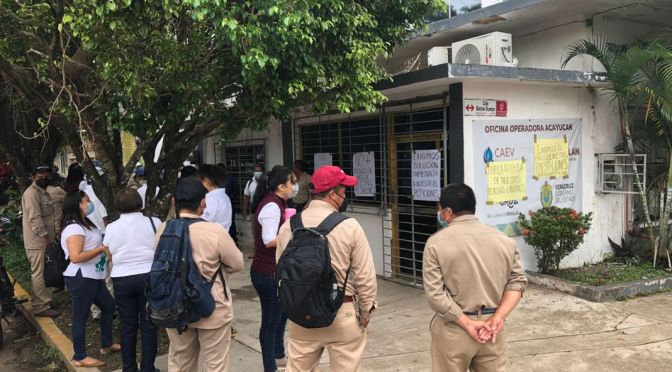 Acayucan, Ver. 20 de agosto 2021.- Un grupo de trabajadores de la Comisión de Agua del Estado de Veracruz (CAEV) se plantó a las afueras de esta oficina ubicada sobre las calles Melchor Ocampo y Gutiérrez Zamora, para exigir el pago de prestaciones que no han recibido desde el año 2019.