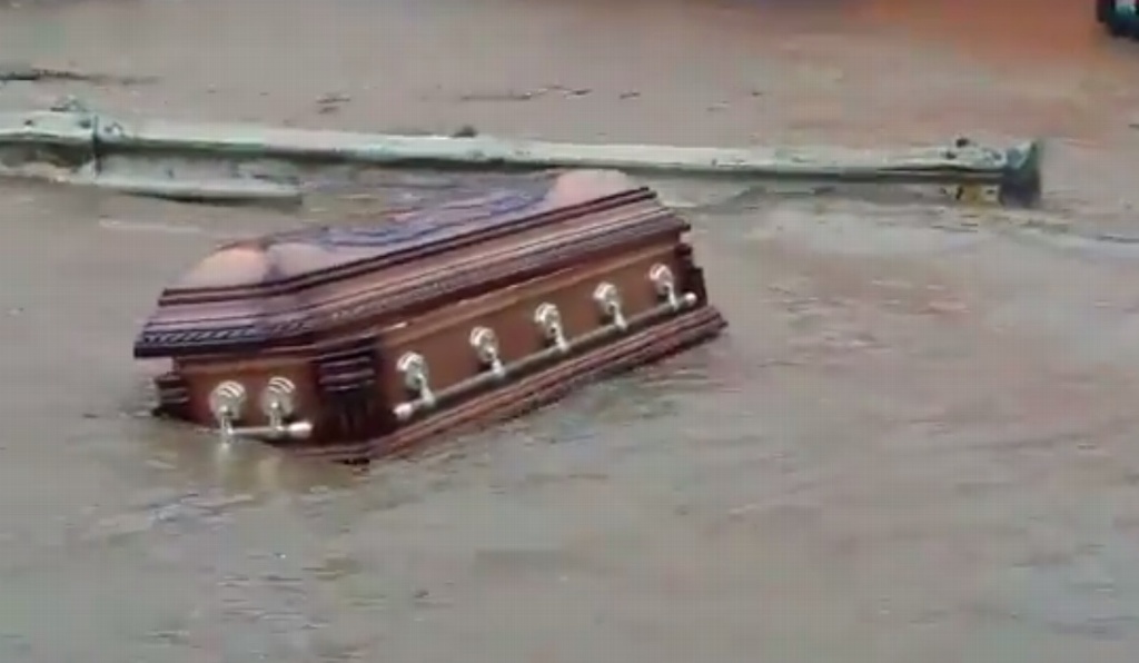 Esta mañana, ante las severas inundaciones registradas en la capital del estado, en uno de los videos compartidos por usuarios de redes sociales, se observa un ataúd flotando en medio de una avenida.