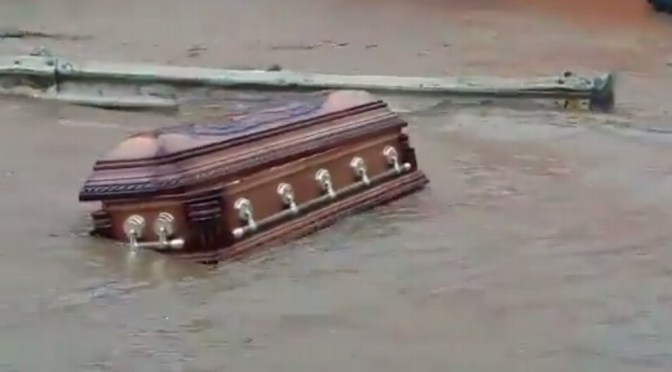 En otro video se observa no solo un féretro sino dos siendo arrastrado por la fuerte corriente.