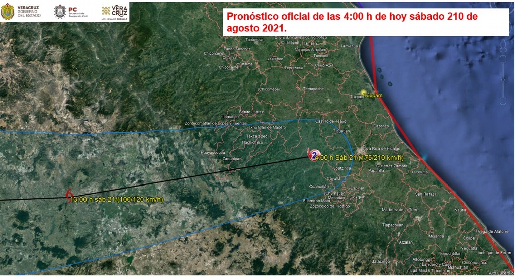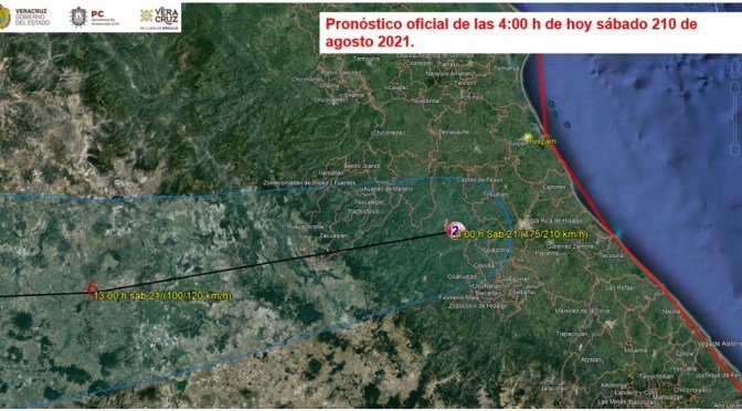El área de Meteorología de la Secretaría de Protección Civil del estado de Veracruz, informó que a las cuatro de la mañana de este sábado, el huracán Grace, de categoría 2, avanza en tierra sobre el estado de Puebla.