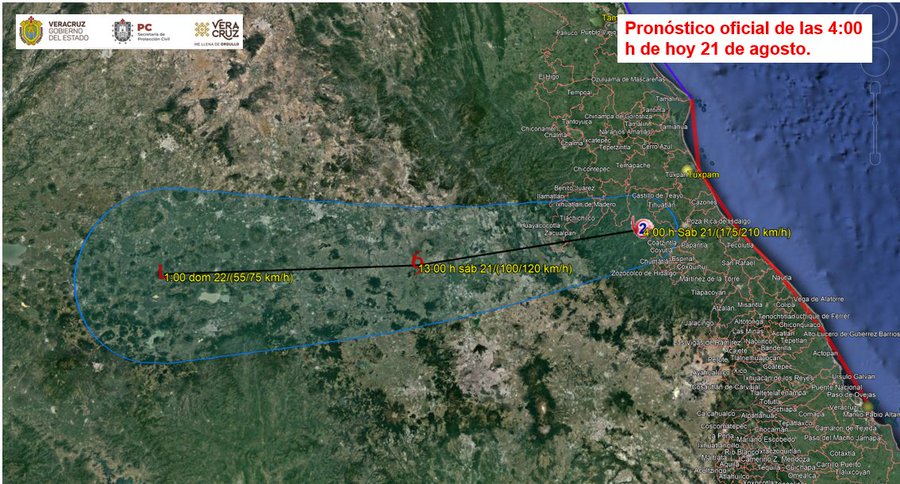 Asimismo, señala que el fenómeno meteorológico podría volver a tocar territorio veracruzano en la parte alta de la región de Huayacocotla.