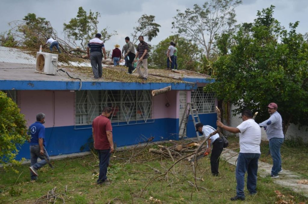 En el recorrido a las escuelas el Secretario llegó acompañado de una brigada de profesores que se sumaron a las labores de limpieza de las escuelas, sobre todo para la poda de árboles derribados a causa del huracán.