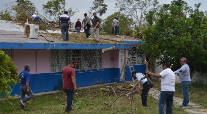 En el recorrido a las escuelas el Secretario llegó acompañado de una brigada de profesores que se sumaron a las labores de limpieza de las escuelas, sobre todo para la poda de árboles derribados a causa del huracán.