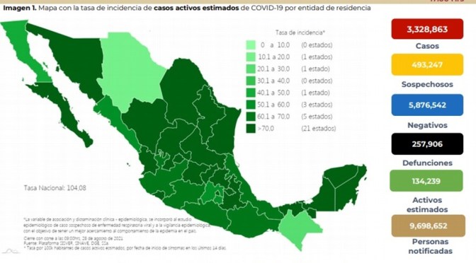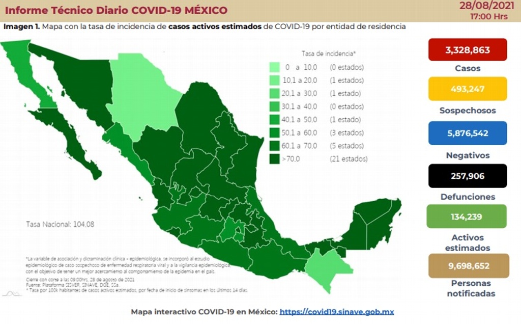De acuerdo con el Informe Técnico publicado en el portal de dependencia, en territorio mexicano se han acumulado 3 millones 328 mil 863 casos confirmados.