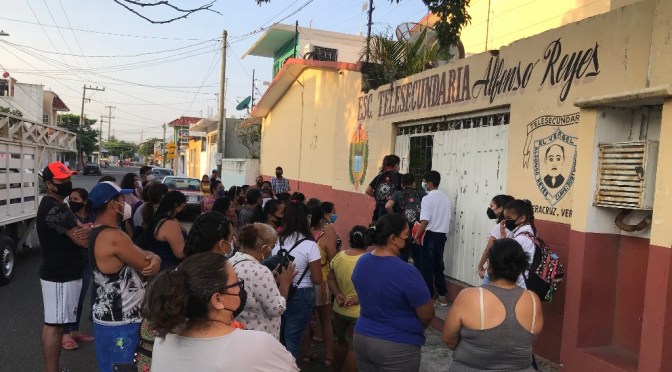 Fue en la telesecundaria “Alfonso Reyes” en este municipio de Veracruz, donde llegaron los alumnos con sus papás para formarse, en varias ocasiones sin la “sana distancia” como se recomienda, y los adultos juntos en espera de que sus hijos entraran para comenzar el nuevo ciclo escolar.