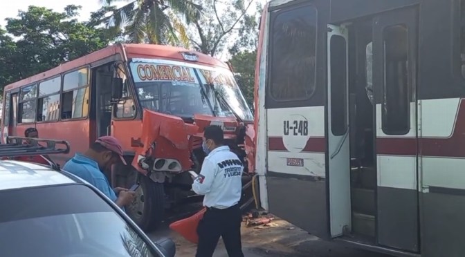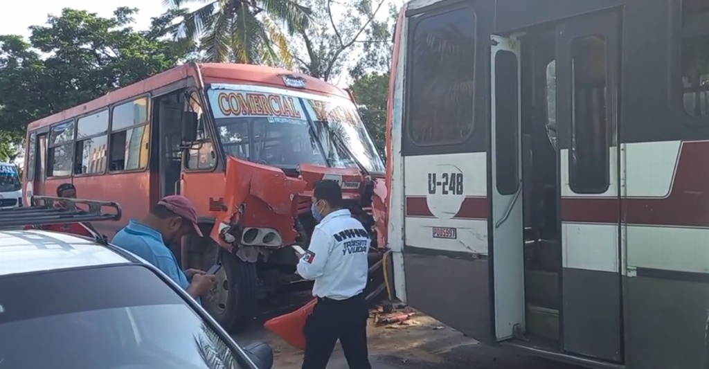 Los hechos ocurrieron cuando el conductor del camión con número económico 940 de la ruta Comercial Mexicana circulaba presuntamente a exceso de velocidad, chocó a otro camión de la ruta Manantial con número económico 248.