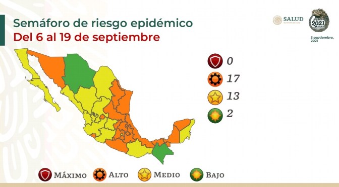 La dependencia federal indicó que del 6 al 19 de septiembre, ninguna entidad federativa estará en rojo de riesgo máximo del Semáforo de Riesgo Epidémico; dos estarán en verde, 13 en amarillo y 17 en naranja.