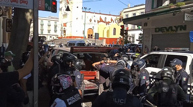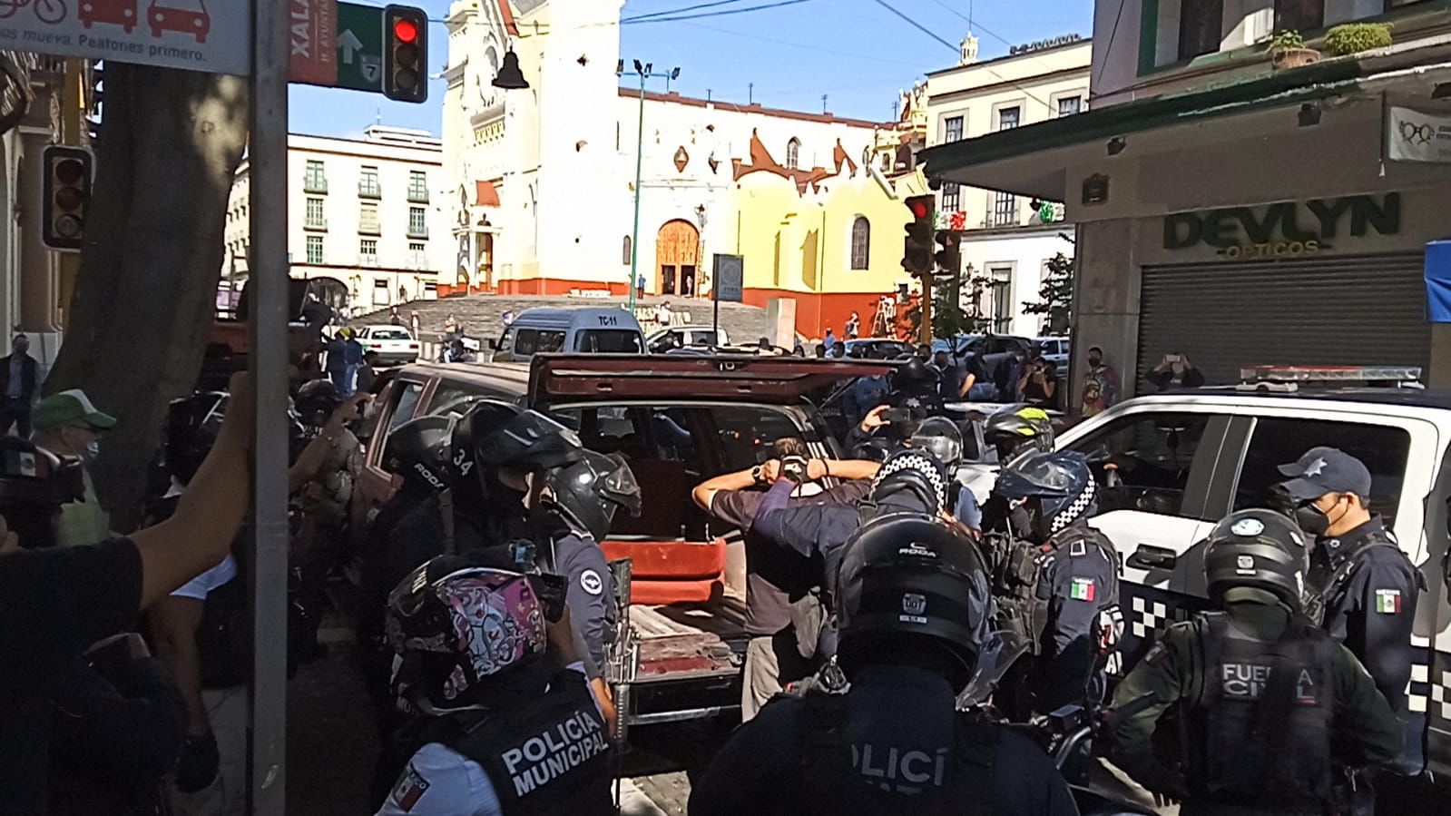 Alrededor de las 10 de la mañana de este viernes, la camioneta color guinda circulaba en calles del primer cuadro de la ciudad cuando al menos una veintena de policías le marcaron el alto.