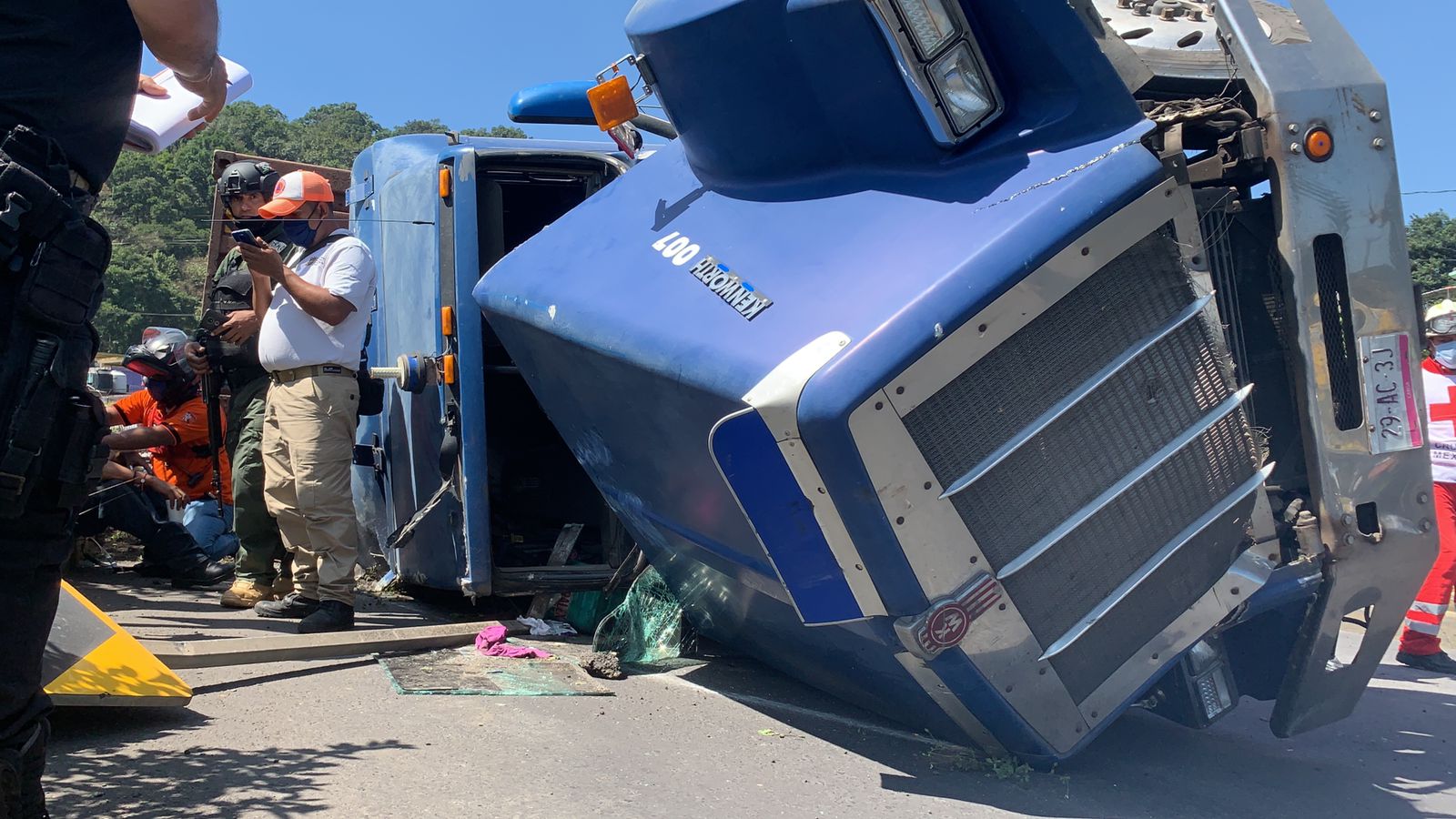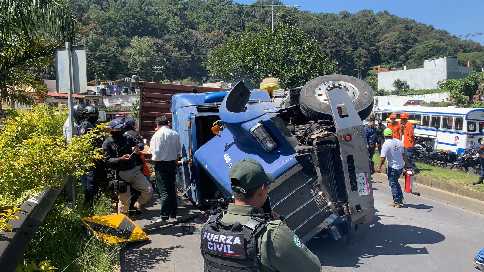 BANDERILLA, VER.- Una unidad pesada de doble remolque volcó sobre la carretera Xalapa-Banderilla unas horas después de que un autobús de servicios turísticos impactará al menos a ocho vehículos particulares en la misma zona.