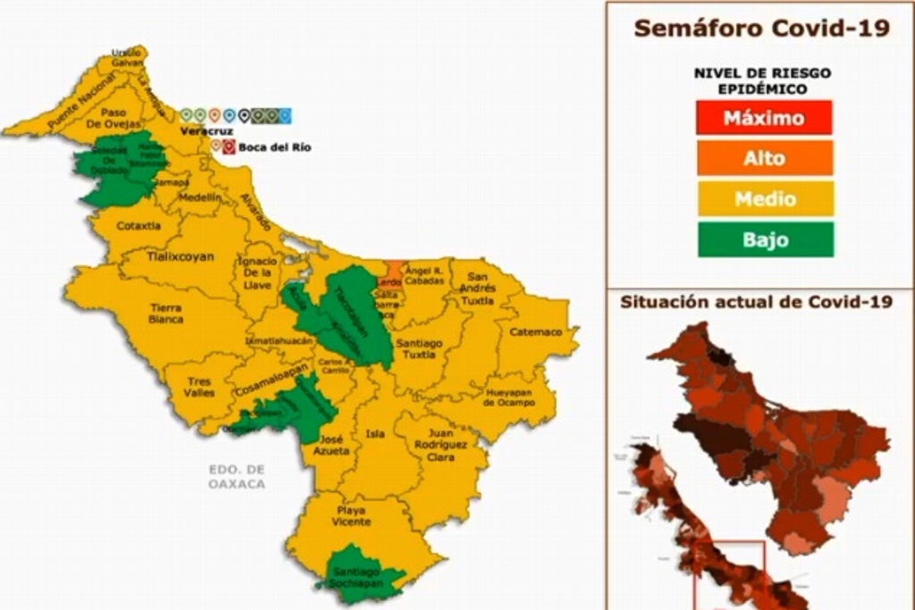 De acuerdo con el semáforo estatal de riesgo de COVID-19 correspondiente al periodo del 18 al 31 de octubre de 2021 presentado por la Secretaría de Salud estatal, los municipios de Veracruz, Boca del Río, Medellín y Alvarado se ubican en amarillo o riesgo medio.