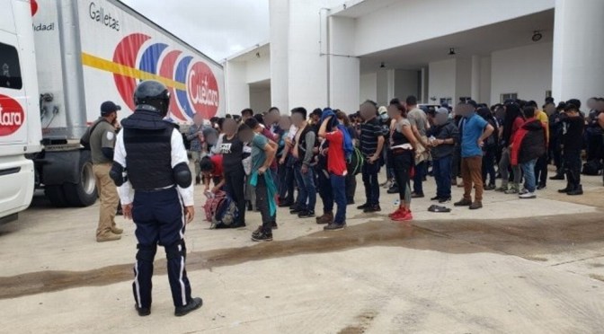 Los migrantes viajaban a bordo de un tráiler propiedad de una compañía galletera, con placas de circulación 66-UJ-5H del servicio público federal y marcada con el número económico 318.