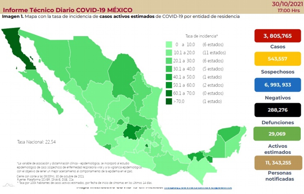 Este sábado 30 de octubre la Secretaría de Salud federal informó que en el país ya suman 288 mil 276 defunciones por COVID-19 desde el inicio de la epidemia en México, lo que representa un incremento de 325 con respecto a lo reportado el viernes.