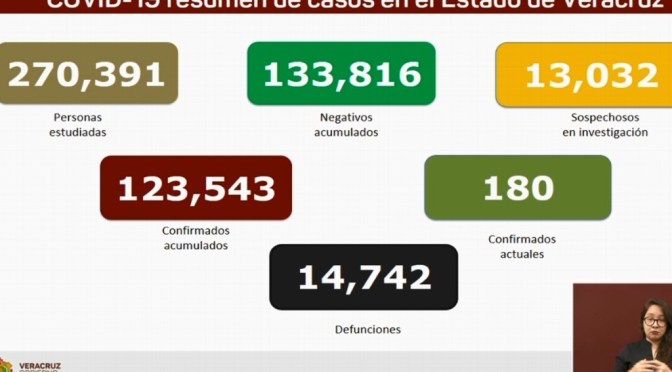 Asimismo, el titular de la dependencia, Roberto Ramos Alor, dio a conocer que ya se acumulan 123 mil 543 casos confirmados, lo que representa un incremento 41 contagios con relación a los reportados el día de ayer. Hay 180 casos activos.