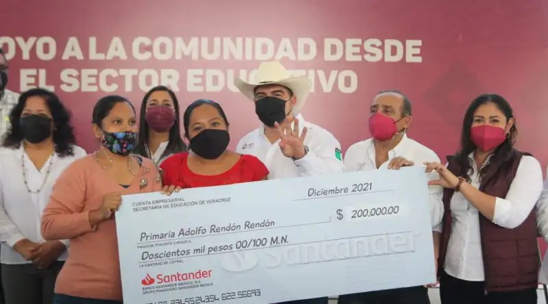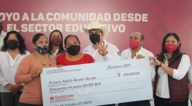 Ante autoridades legislativas y municipales, el titular de la dependencia, Zenyazen Escobar García, entregó de forma simbólica tres cheques por 200 mil pesos a directivos y representantes de patronatos de la Telesecundaria Rosario Castellanos (Coatzintla) y las primarias Francisco I. Madero y Adolfo Rendón Rendón (Poza Rica).