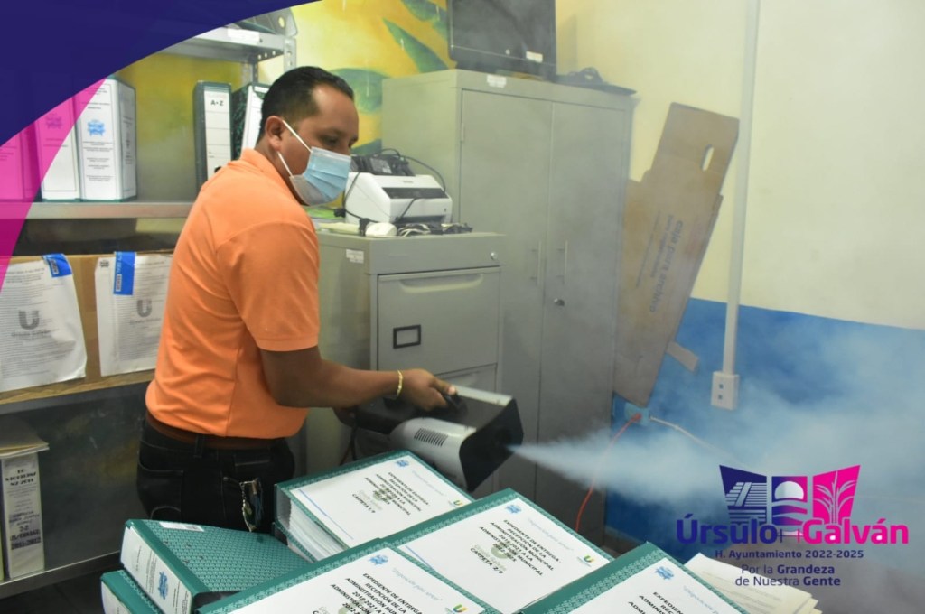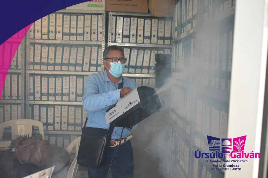 Derivado del aumento en el número de casos positivos a coronavirus en zonas aledañas, este miércoles a través de la Dirección Municipal de Salud las oficinas y espacios comunes del inmueble que alberga el H. Ayuntamiento de Úrsulo Galván fueron sanitizados.