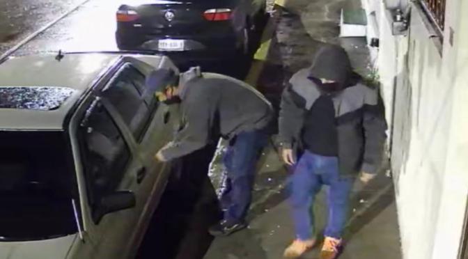 En los videos, se muestra a dos sujetos llegar al lugar, uno se queda más atrás para vigilar mientras que el otro comienza a forzar la chapa de la puerta de automóvil. Al poder abrirla, intenta arrancar la unidad pero no logra encenderlo, es entonces cuando el segundo ladrón entra en acción y empuja el vehículo hasta llevárselo.