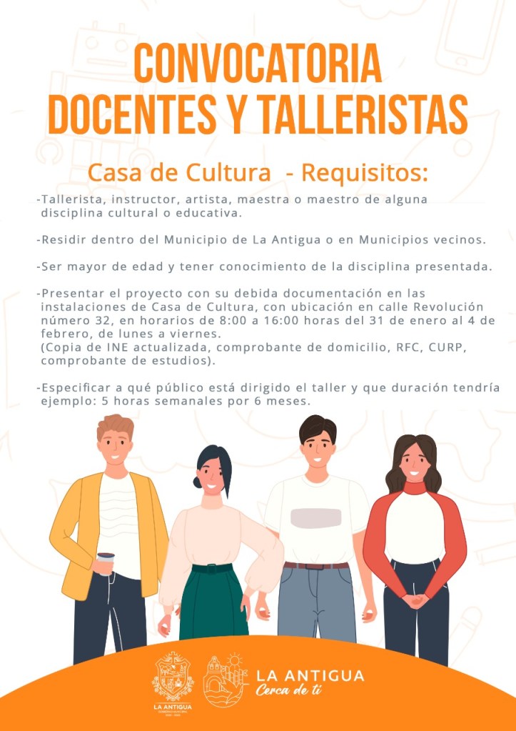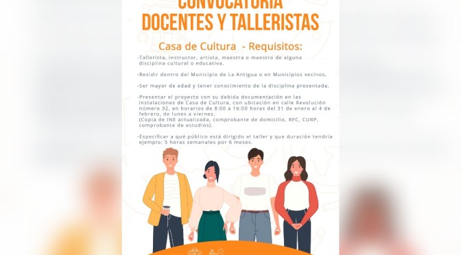 La Antigua, Ver.- Impulsando la implementación de actividades culturales y artísticas en el municipio, el H. Ayuntamiento de La Antigua a través de la sindicatura a cargo de la dirección de Educación y la Casa de la Cultura en Cardel, lanzó una convocatoria para talleristas, instructores, artistas, maestras o maestro de alguna disciplina cultural o educativa, que deseen impartir talleres, cursos o clases.