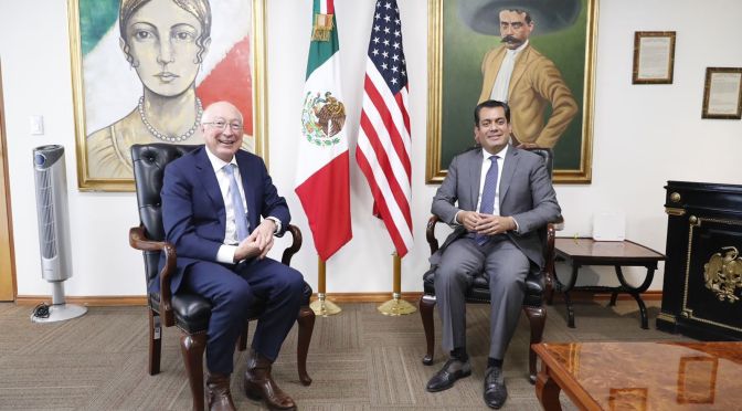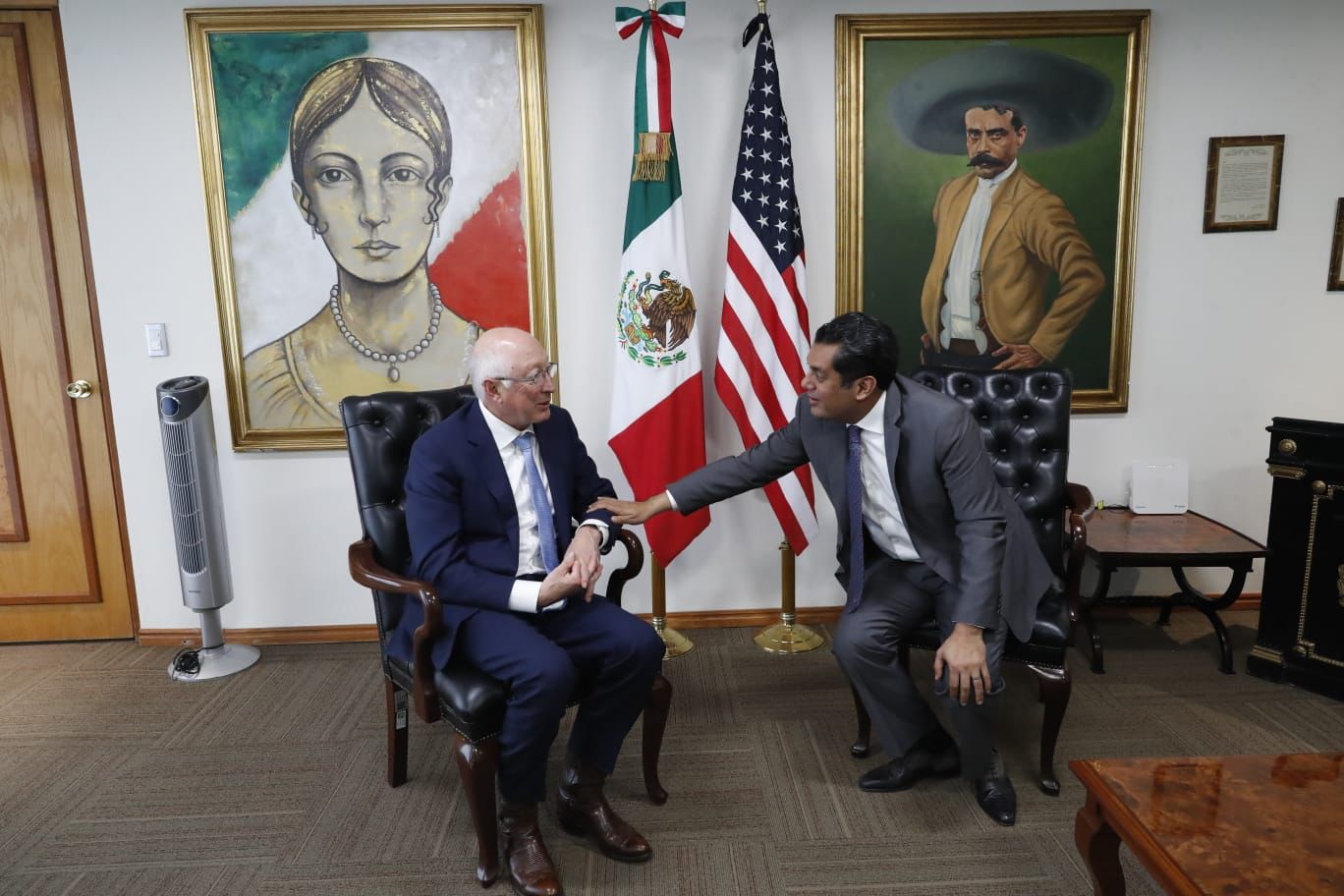 Ciudad de México, 3 de febrero de 2022.- El presidente de la Cámara de Diputados, el veracruzano Sergio Gutiérrez Luna, recibió al embajador de Estados Unidos en México, Ken Salazar; ambos plantearon abordar temas de interés binacional así como visitas recíprocas a Veracruz y Colorado para conocer y vincular las fortalezas de ambos estados.