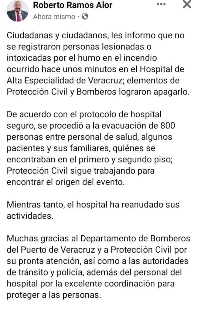 Ciudadanas y ciudadanos, les informo que no se registraron personas lesionadas o intoxicadas por el humo en el incendio ocurrido hace unos minutos en el Hospital de Alta Especialidad de Veracruz; elementos de Protección Civil y Bomberos lograron apagarlo.