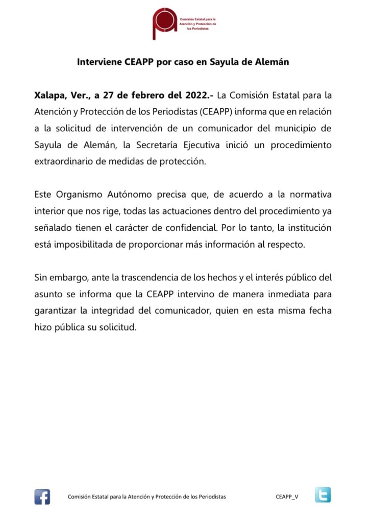 Xalapa, Ver. a 27 de febrero del 2022.- La Comisión Estatal para la Atención y Protección de los Periodistas (CEAPP) informa que en relación a la solicitud de intervención de un comunicador del municipio de Sayula de Alemán, la Secretaría Ejecutiva inició un procedimiento extraordinario de medidas de protección.