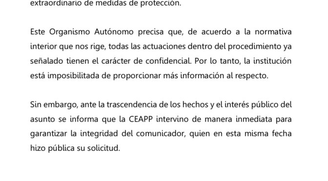 Sin embargo, ante la trascendencia de los hechos y el interés público del asunto se informa que la CEAPP intervino de manera inmediata para garantizar la integridad del comunicador, quien en esta misma fecha hizo pública su solicitud.