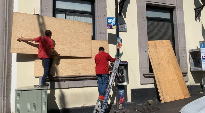 De acuerdo con el Administrador del Pasaje Tanos del centro de Xalapa, Gerardo Libreros Cobos, desde primera hora se buscará bajar cortinas a la mitad y protegerse con estructuras de madera o metal para evitar destrozos.