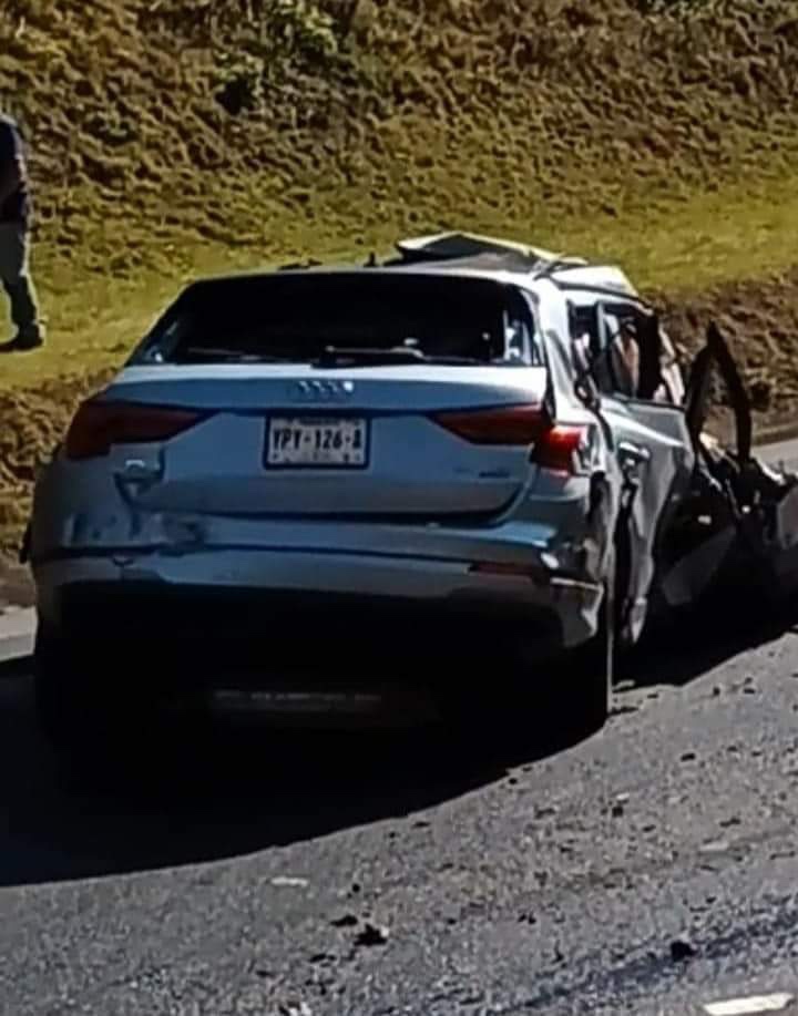 El accidente se dió este martes en la autopista México-Tuxpan, ambos viajaban a bordo de una camioneta marca Audi, color plateado, con placas de circulación del estado de Veracruz YPY-126-A, cuando chocaron de forma brutal contra un camión de carga de color blanco cuya caja quedó desprendida.