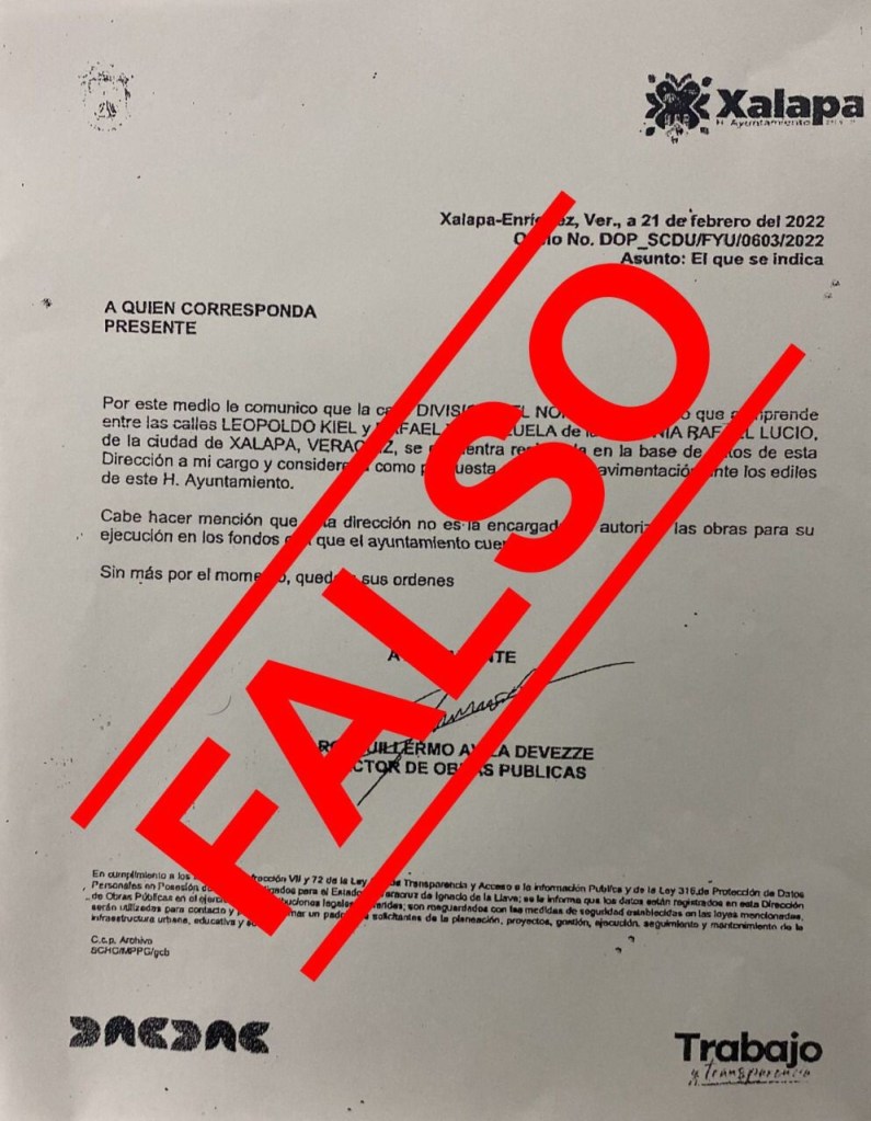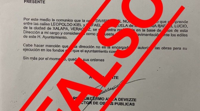 El Ayuntamiento de Xalapa informa que se difunde un documento falso de la Dirección de Obras Públicas relacionado con el programa de obra pública 2022, por lo que se tomarán las medidas legales contra quien resulte responsable por la falsificación de documento oficial y firma de funcionario público.