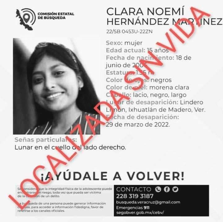 Días antes, autoridades y familiares solicitaban a la ciudadanía en general, el apoyo para localizar a Clara Noemí Hernández Martínez de 15 años de edad tras no haber rastro de su paradero.