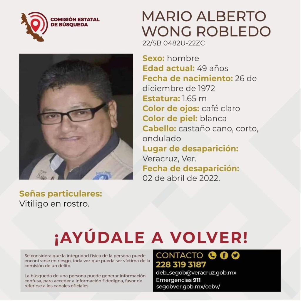Xalapa, Ver., a 05 de abril de 2022.- La Comisión Estatal para la Atención y Protección de los Periodistas (CEAPP) informa que durante la noche de este lunes se recibió una solicitud de intervención por la desaparición del comunicador Mario Alberto Wong Robledo, integrante de la plataforma digital Umbrella Veracruz, desde donde ejerce la libertad de expresión.