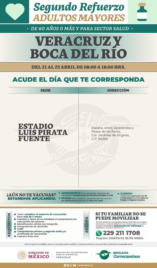 - Veracruz y Boca del Río estarán vacunando del 21 al 23 de abril en el Estadio “Luis Pirata Fuente”