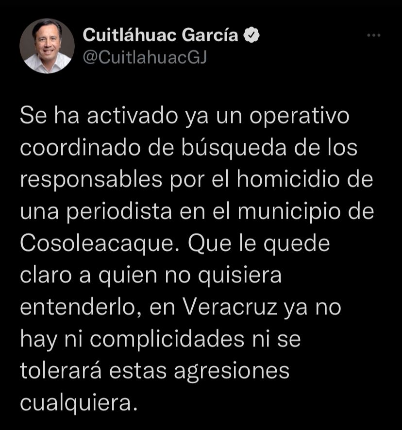 Xalapa, Ver. – Ante el ataque registrado a periodistas del sur de Veracruz, el gobernador del Estado a través de sus redes sociales informó que “se ha activado ya un operativo coordinado de búsqueda de los responsables por el homicidio de una periodista en el municipio de Cosoleacaque”.